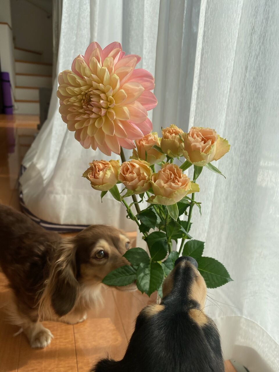 日曜日。近所のイベントで買ってきたダリアとバラ。