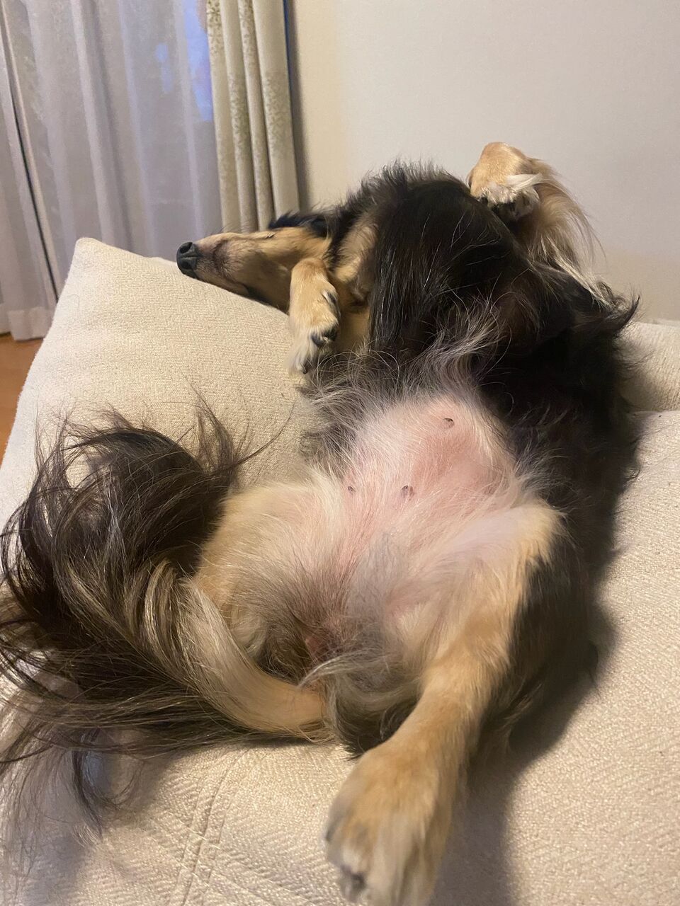 びーちゃん、ソファのクッションにもたれかかっての斜めへそ天。